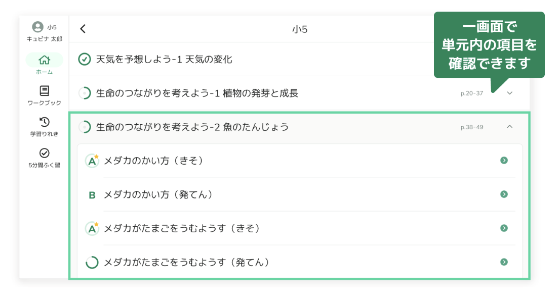ホームから学習開始画面に進む際、単元内の項目を開いて確認できるようになりました。