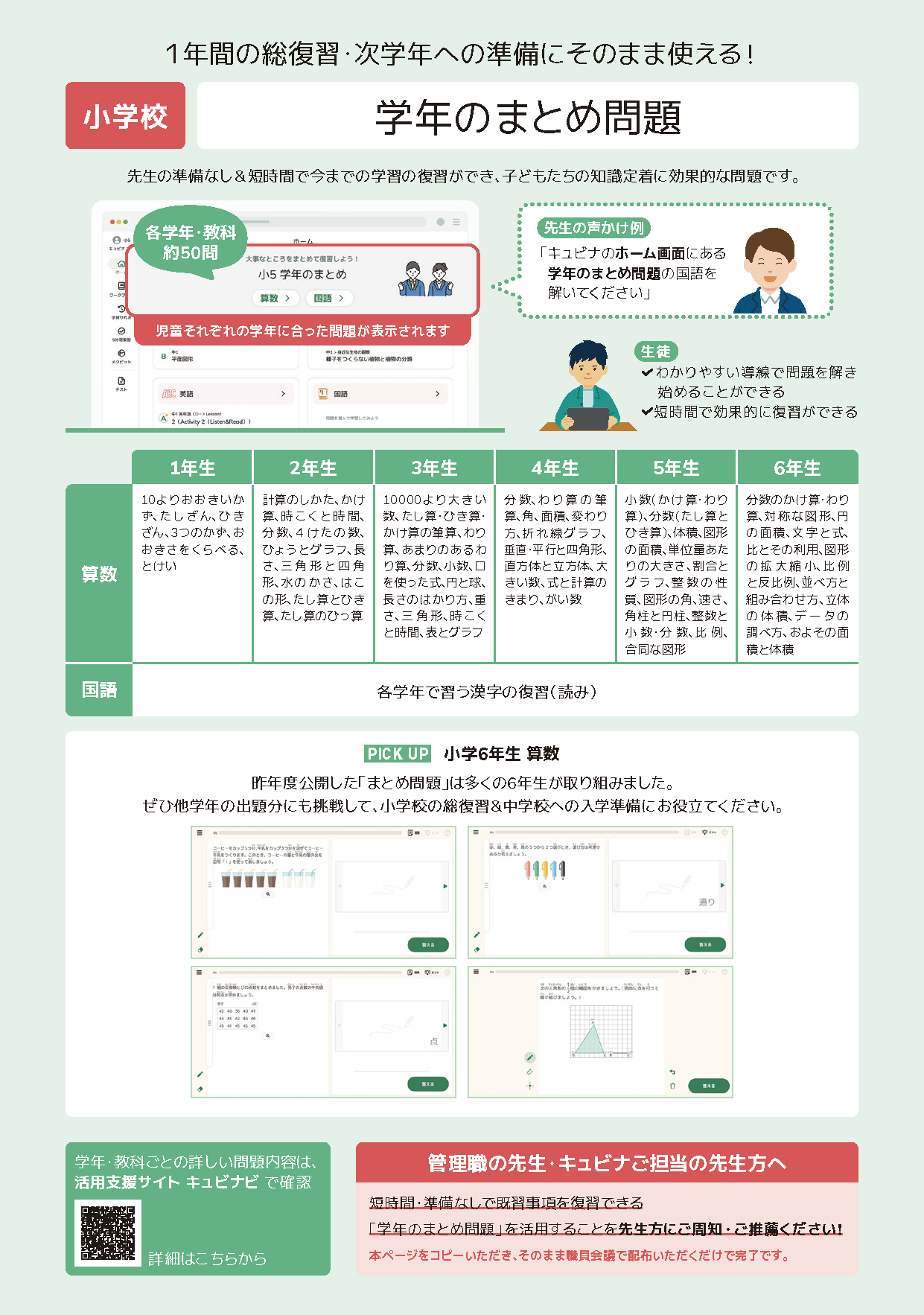ホーム画面のバナーは学年のまとめ問題に変わりますが、「冬のまとめドリル」など過去の問題は引き続きキュビナ・キュビナマネージャーからご利用いただけます。