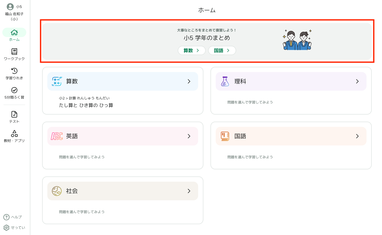 小学生は「学年のまとめ」、中学1-2年生は「学年末まとめ問題」、中学3年生は「高校入試対策問題」がトップ画面に掲載されます。