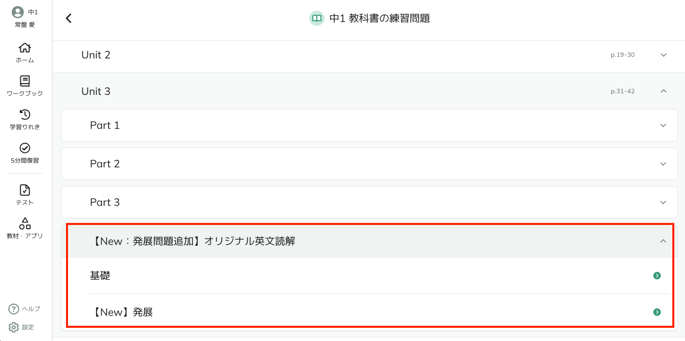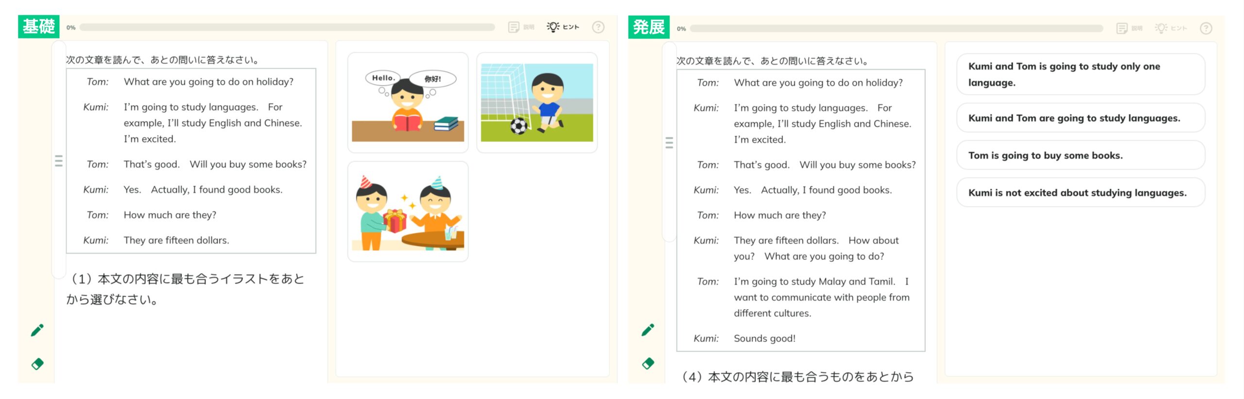 これにより、児童生徒の習得したいレベルに応じた読解問題を通して、単元ごとの重要文法、表現、語彙の定着ができるようになります。