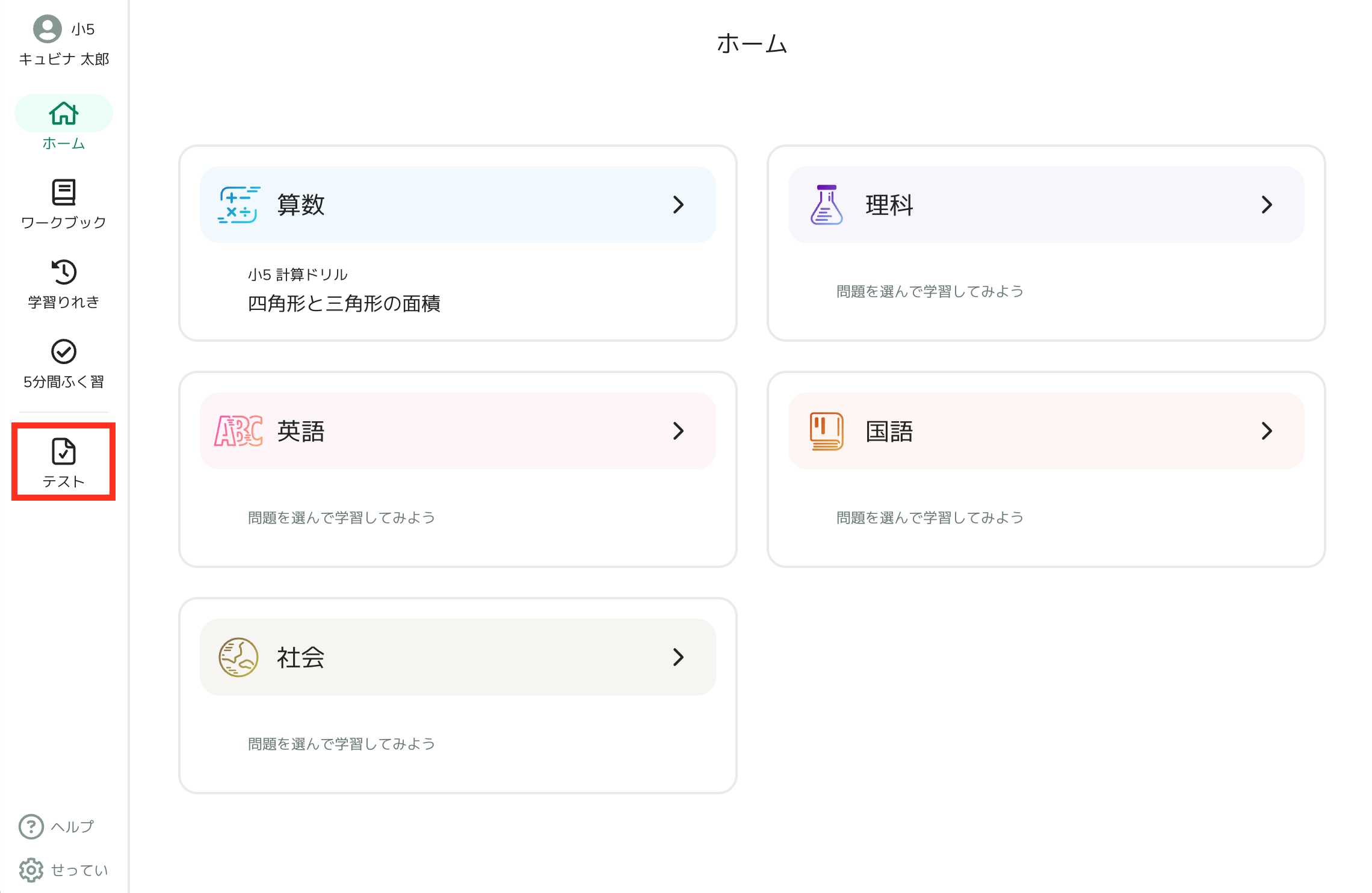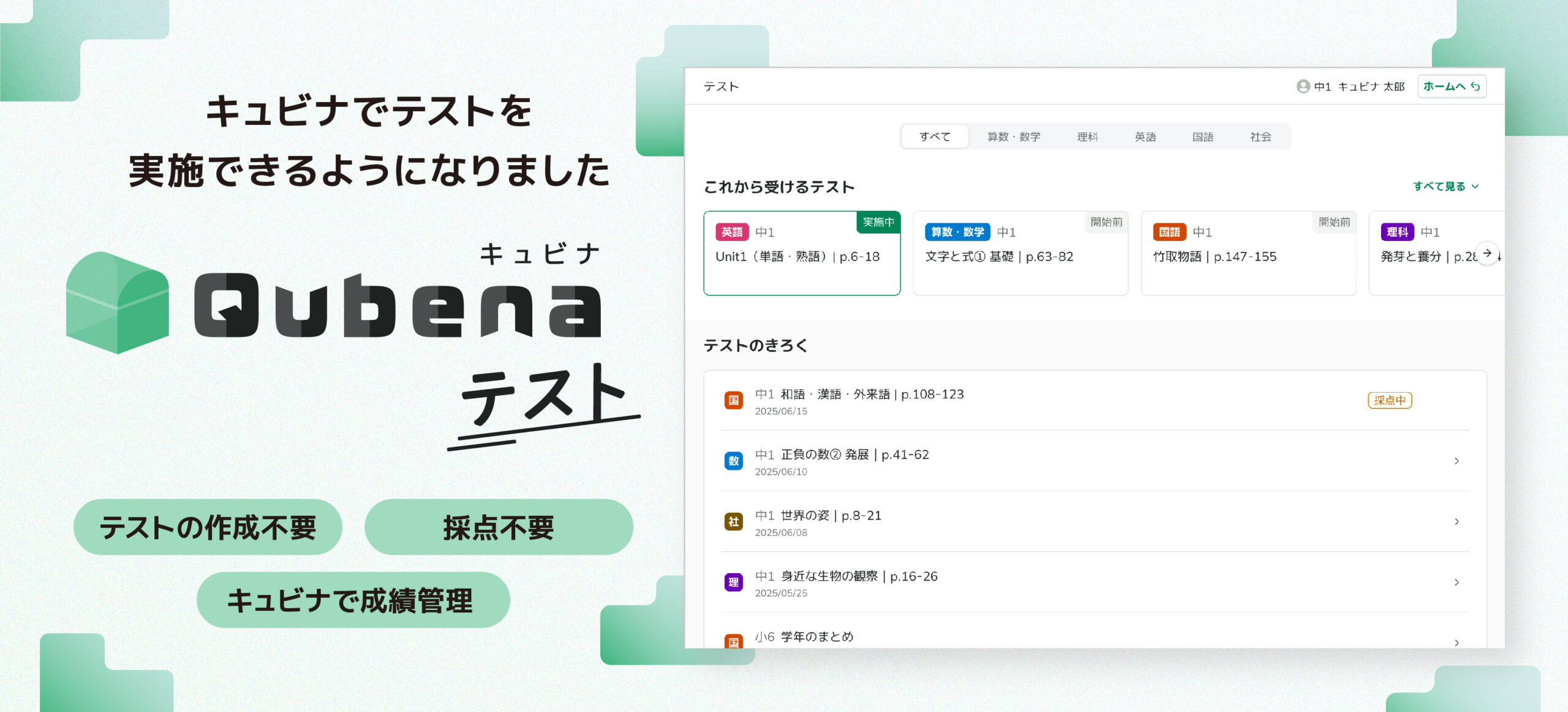 小学・中学の全9学年5教科において、主要教科書の全単元に対応した「キュビナ テスト」を追加しました。
