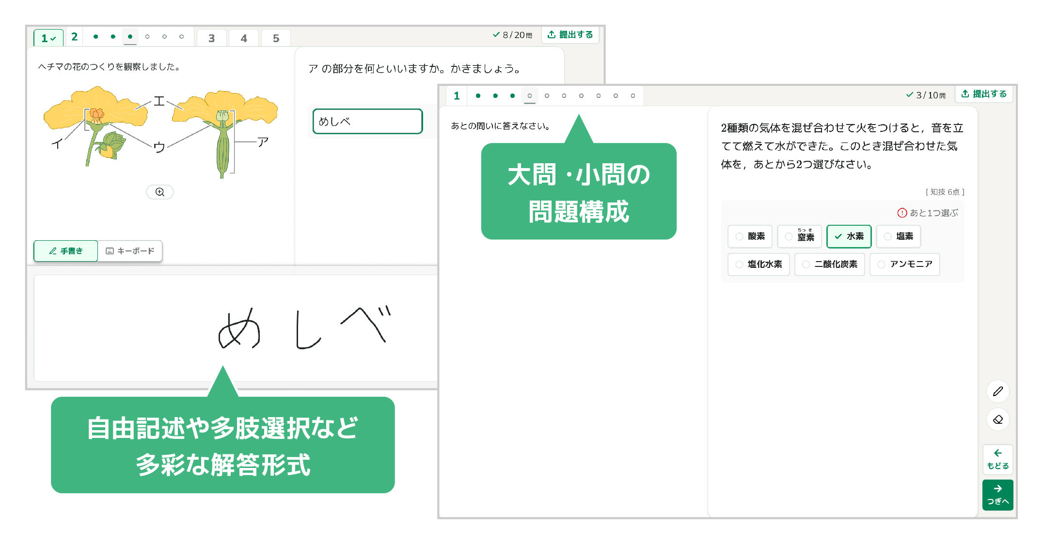 「キュビナ テスト」は紙のテストと同様の問題構成、解答形式やわかりやすい画面デザインで、カラーテストや単元テストの代替としてスムーズにご利用いただける、デジタルテスト(CBT)サービスです。
